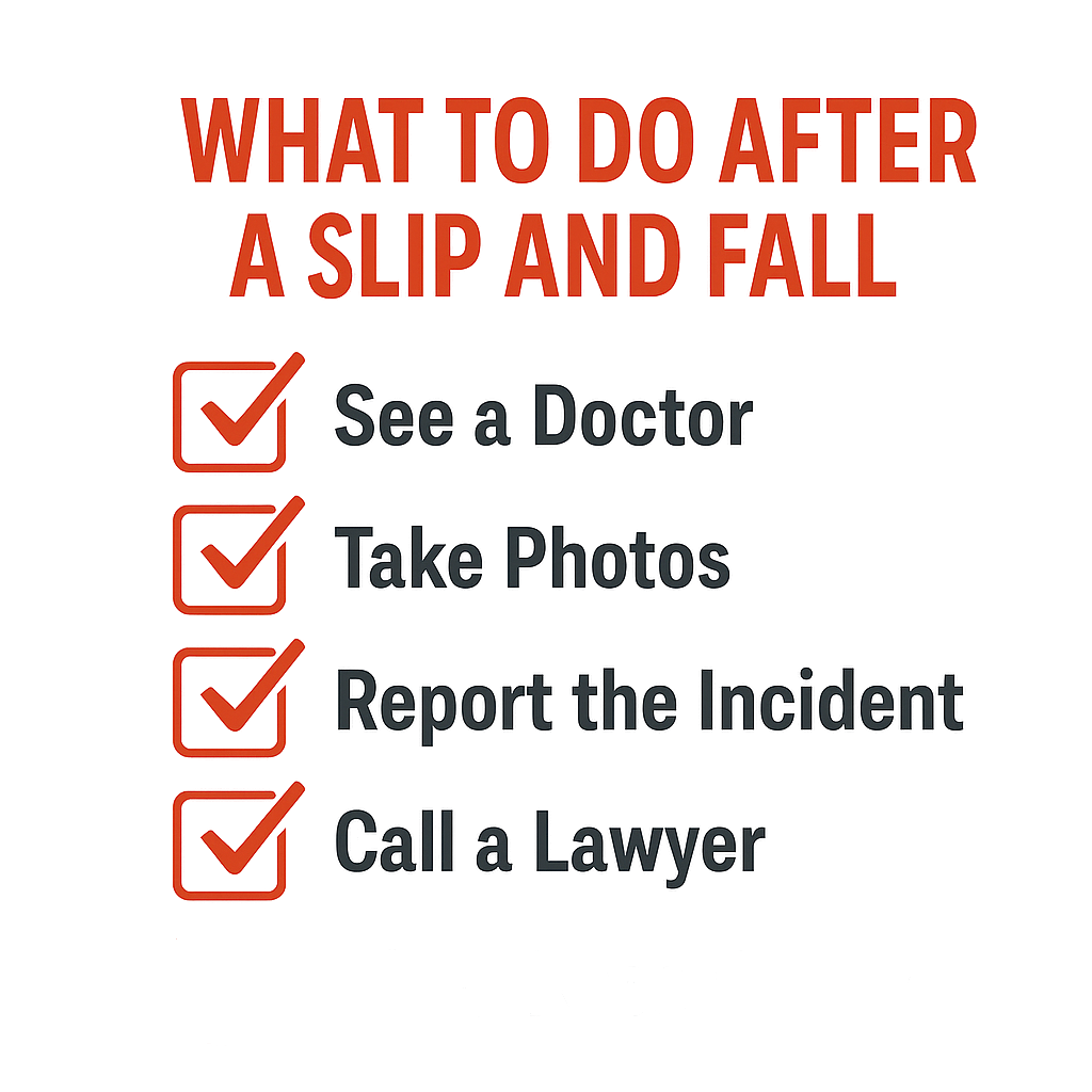 Get checked out by a doctor, even if you think the injury isn’t serious. Report what happened to the property owner or manager, and try to take photos of where you fell and any visible injuries. Keep notes on everything. And before you talk to the insurance company, it’s smart to speak with a lawyer who can guide you through what to say and what not to.